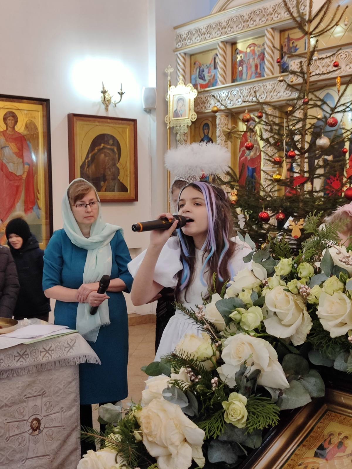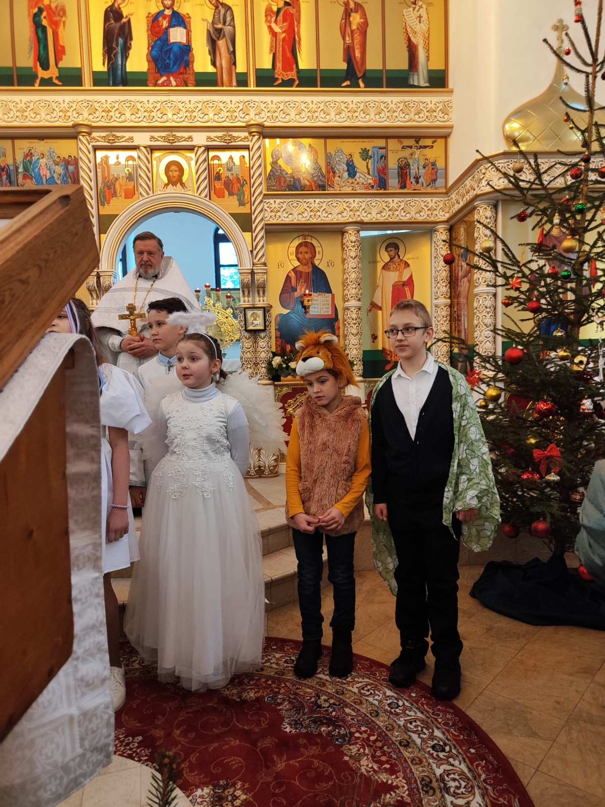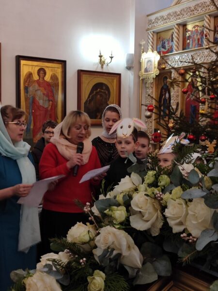 11 января учащиеся Воскресной школы храма святого великомученика и целителя Пантелеимона поздравили прихожан с Рождеством Христовым,со Святками.Ребята подготовили небольшой концерт: пели ,читали стихи, показали сказку » Ночь перед Рождеством».Сказку, интересную и взрослым ,и детям ,которая закончилась мудрыми словами: