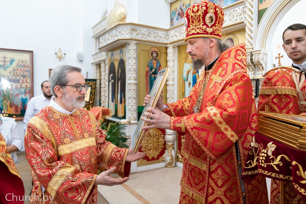 Затем с приветственным словом к Высокопреосвященнейшему владыке обратился настоятель храма протоиерей Сергий Пашкевич, в котором поздравил его с праздником и поблагодарил за совместное богослужение. На молитвенную память архипастырю была подарена икона Божией Матери «Всецарица».