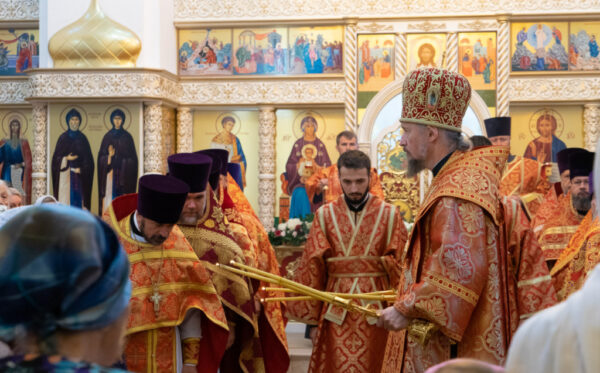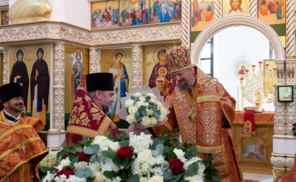 По окончании богослужения владыка обратился к присутствующим со словом назидания, поздравил причастников с принятием Святых Христовых Таин и преподал верующим архипастырское