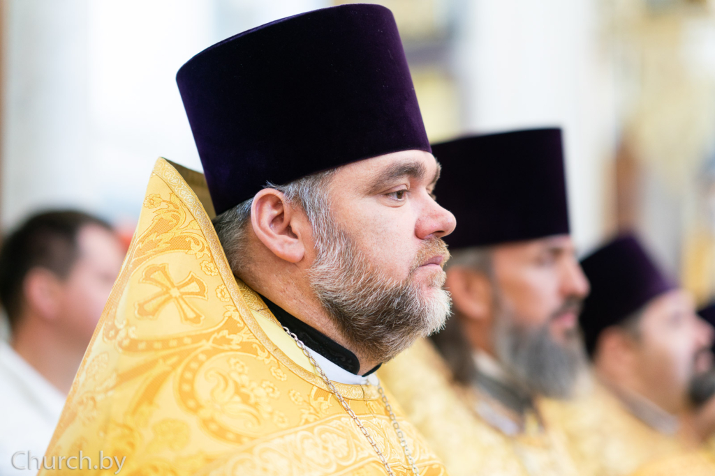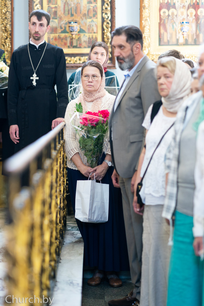 Архипастырям сослужили: председатель Синодального отдела по сотрудничеству со светскими учреждениями образования Белорусской Православной Церкви протоиерей Фёдор Повный; благочинный церквей 1-го Минского городского благочиния, настоятель Петропавловского собора города Минска протоиерей Георгий Латушко; благочинный церквей 5-го Минского городского благочиния, настоятель прихода храма великомученика Георгия Победоносца города Минска протоиерей Александр Стреха; благочинный церквей 2-го Минского районного благочиния, настоятель Преображенского кафедрального собора города Заславля протоиерей Николай Мозгов; секретарь Минской епархии протоиерей Андрей Волков; секретарь Ученого совета Минской духовной академии иеромонах Андрей (Василюк); председатель Наградной комиссии Белорусского Экзархата, председатель приходского совета Свято-Духова кафедрального собора города Минска иерей Дионисий Ковалев, гости в священном сане и клирики кафедрального собора.
