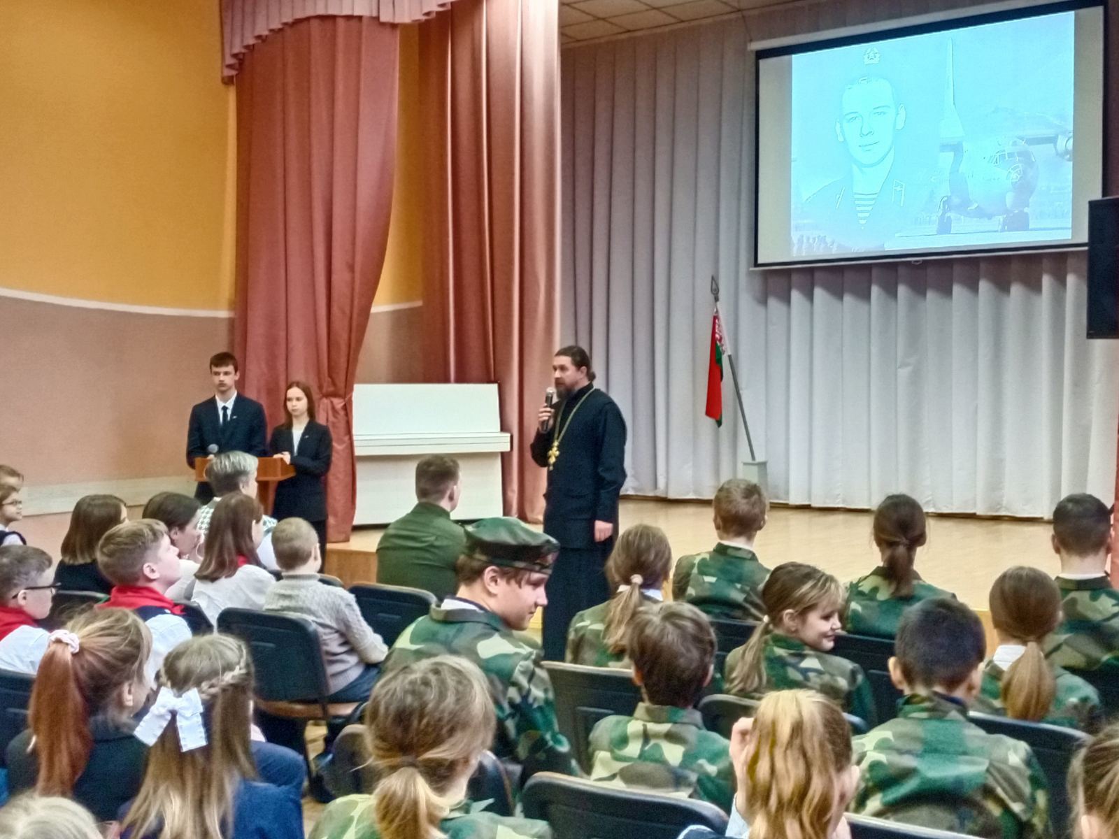 «Что такое настоящее мужество, честь, память и созидательная деятельность во имя сохранения мира», — обратился к учащимся настоятель храма Сошествия Святого Духа в аг. Самохваловичи иерей Сергий Короткий.