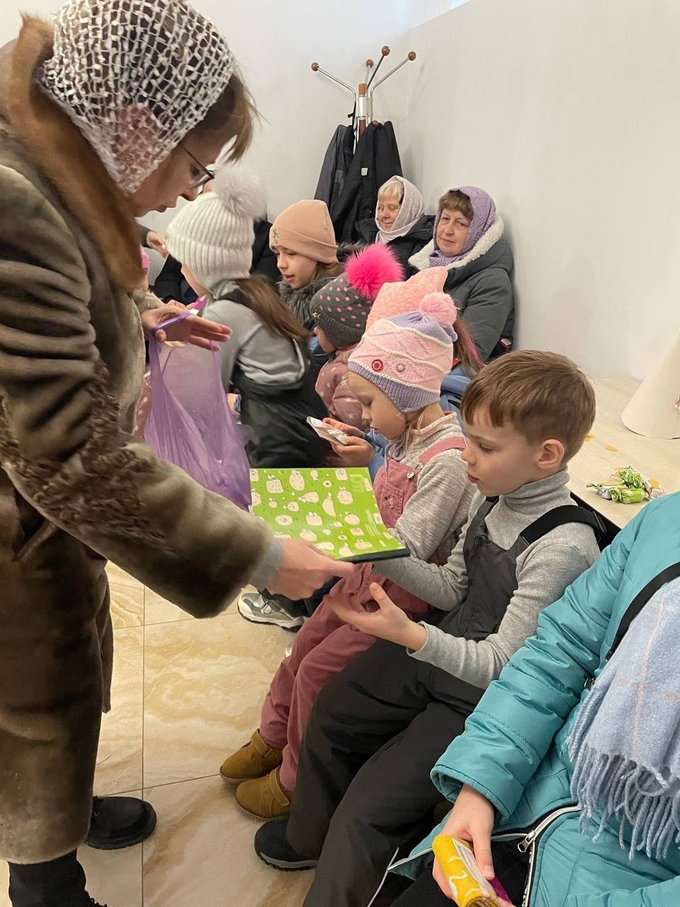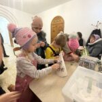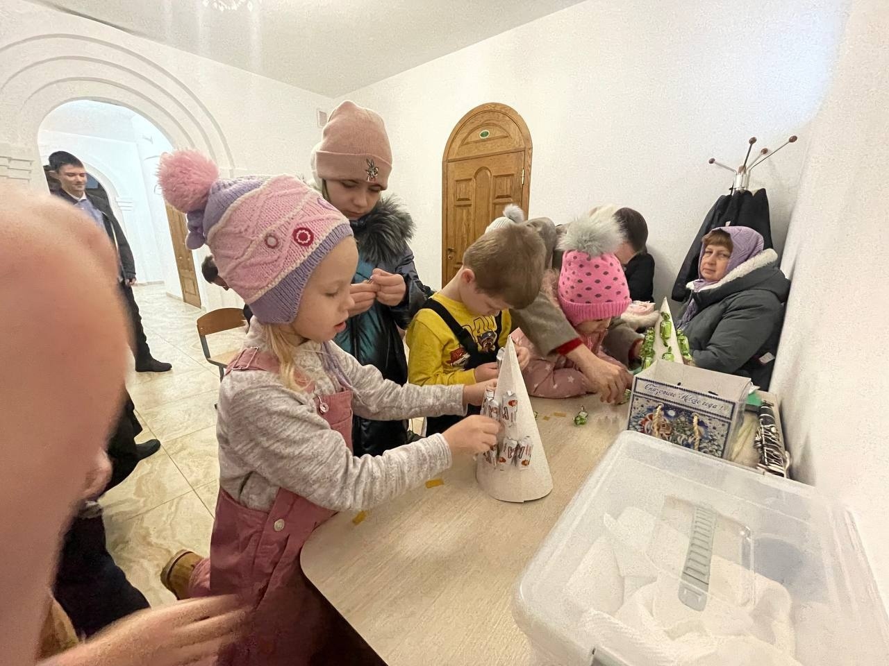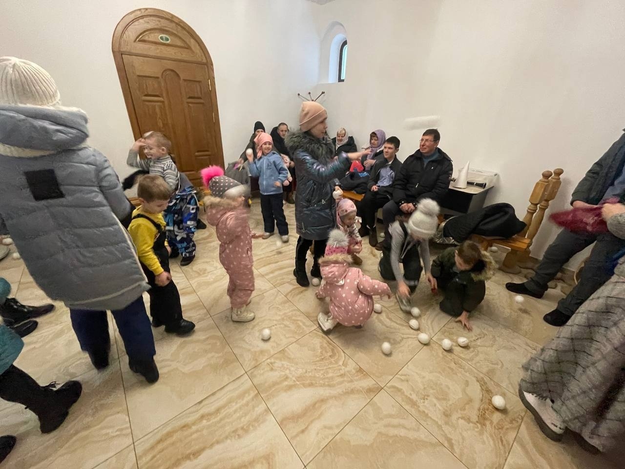 Дети играли в снежки из меха, собирали «сугроб» из бумажных снежинок, ловили наперегонки верёвку, клеили ёлочки из конфет и отгадывали загадки о библейских сюжетах.